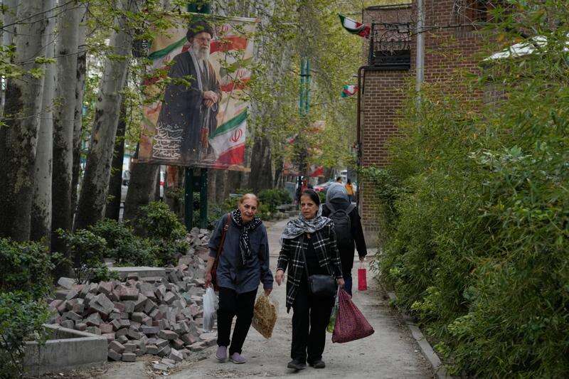 Women walk past a banner depicting the late Iranian Supreme Leader Ayatollah Ali Khamenei, who was killed in the U.S. and Israel strikes on Feb. 28, in northern Tehran, Iran, Sunday, April 12, 2026. (AP Photo/Vahid Salemi) (AP Photo/Vahid Salemi)