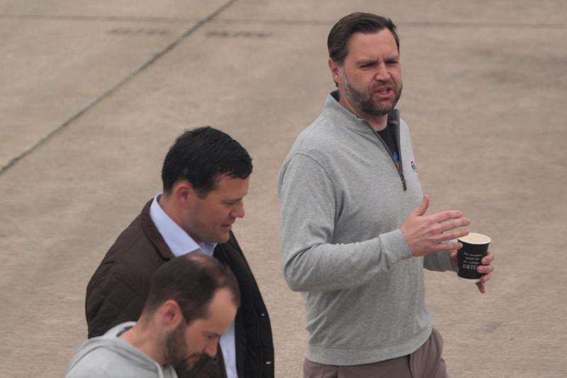Vice President JD Vance walking on the tarmac for a planned refueling stop in Ramstein Air Base in Germany, Sunday, April 12, 2026, after attending talks on Iran. (AP Photo/Jacquelyn Martin, pool) (AP Photo/Jacquelyn Martin, pool)