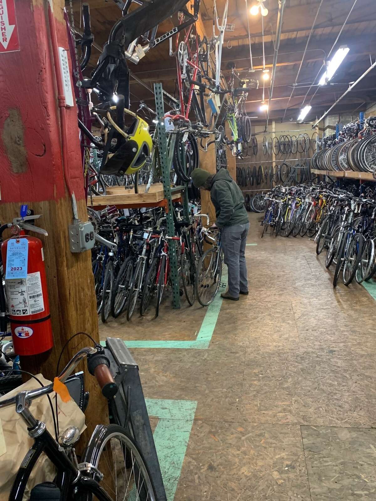 One storage relief valve is the covered trailer Gable purchased and parks at the shop. Used for deliveries and pickups, its capacity is only 35 bikes. At one point, the shop was able to store 200 bikes for free in a nearby storefront thanks to a landlord’s kindness. The downside was getting just three days’ notice to clear them out when the landlord made other plans for that unit.