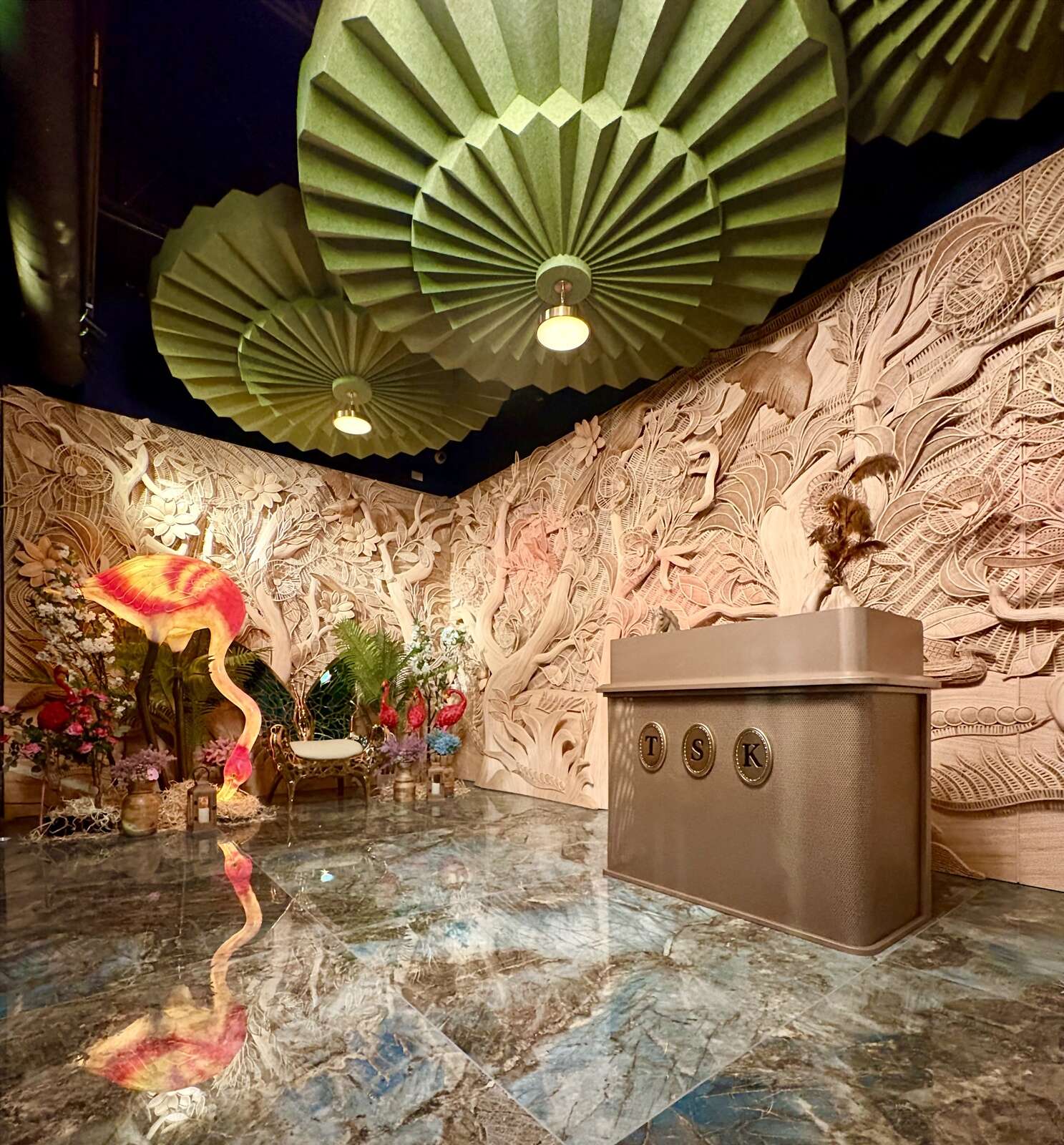 The main dining room features crimson velvet seating, sage green origami lotus ceiling panels, and a brass-and-emerald-glass room divider that casts green-tinted light. Flamingos recur throughout the space as a design motif along with neon wall sculptures, three-dimensional art pieces and figures along the divider shelf.