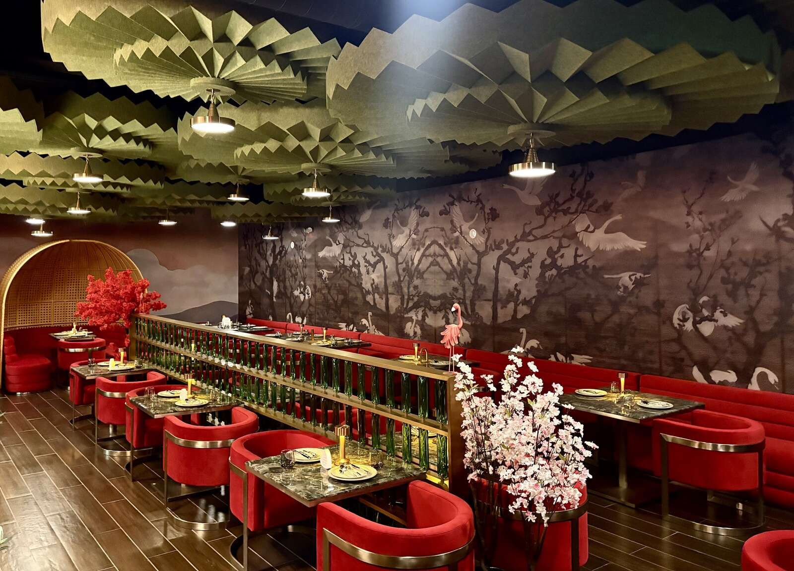 Crimson velvet seating and sage green origami lotus ceiling panels adorn the dining room at The Secret Kitchen in Schaumburg. Courtesy of Kirtan Patel Photography