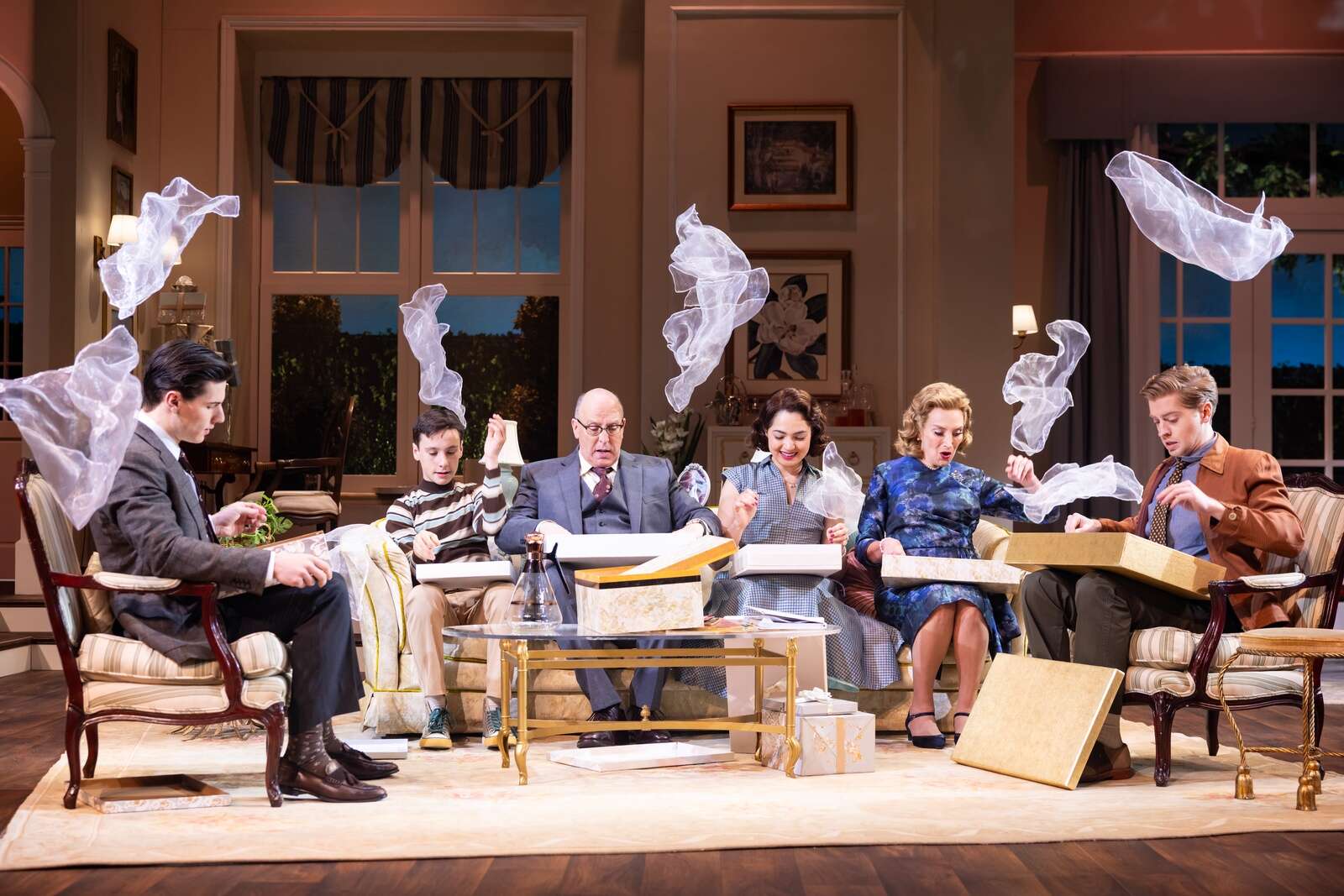 The set is a vintage charmer, from the pastel living room to the retro trays Kay is continually gifted with. Costumes also are a loving tribute to the 1950s, right down to the pillbox hats.