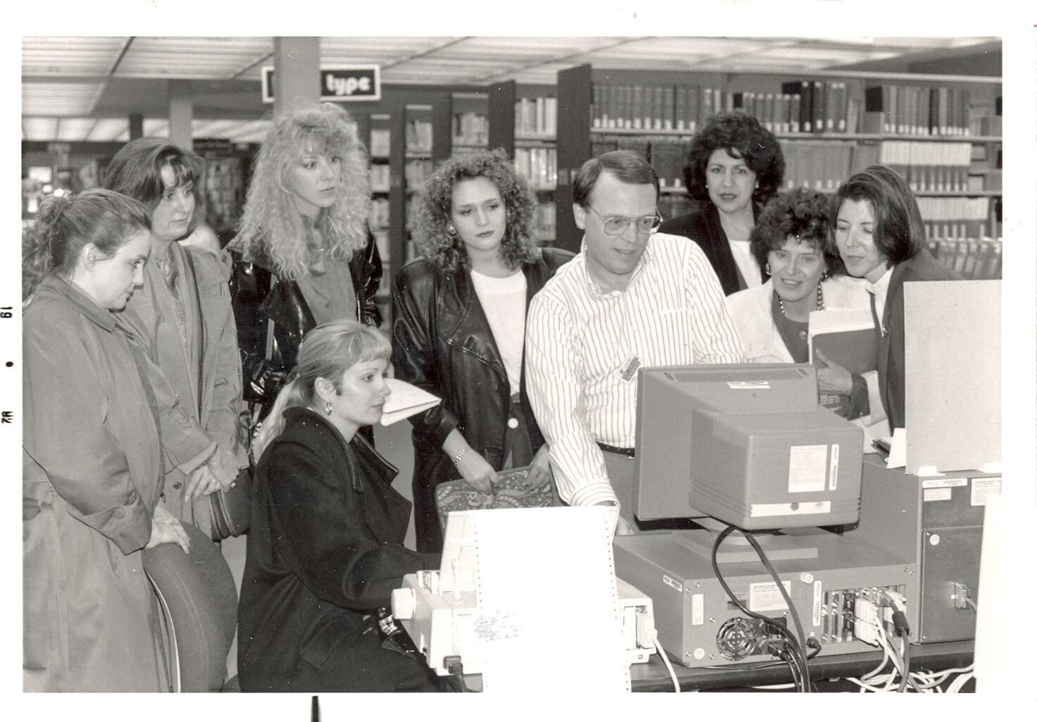 Bennett, who now answers library patrons’ questions at the information desk, call center and via website chat, has seen a lot of the technologies and formats over the years: extensive newspaper and magazine subscriptions, long runs of microfilm and stacks of LP records. Then typewriters, DVDs and audiobooks. Finally, public computers, eBooks and an online catalog.