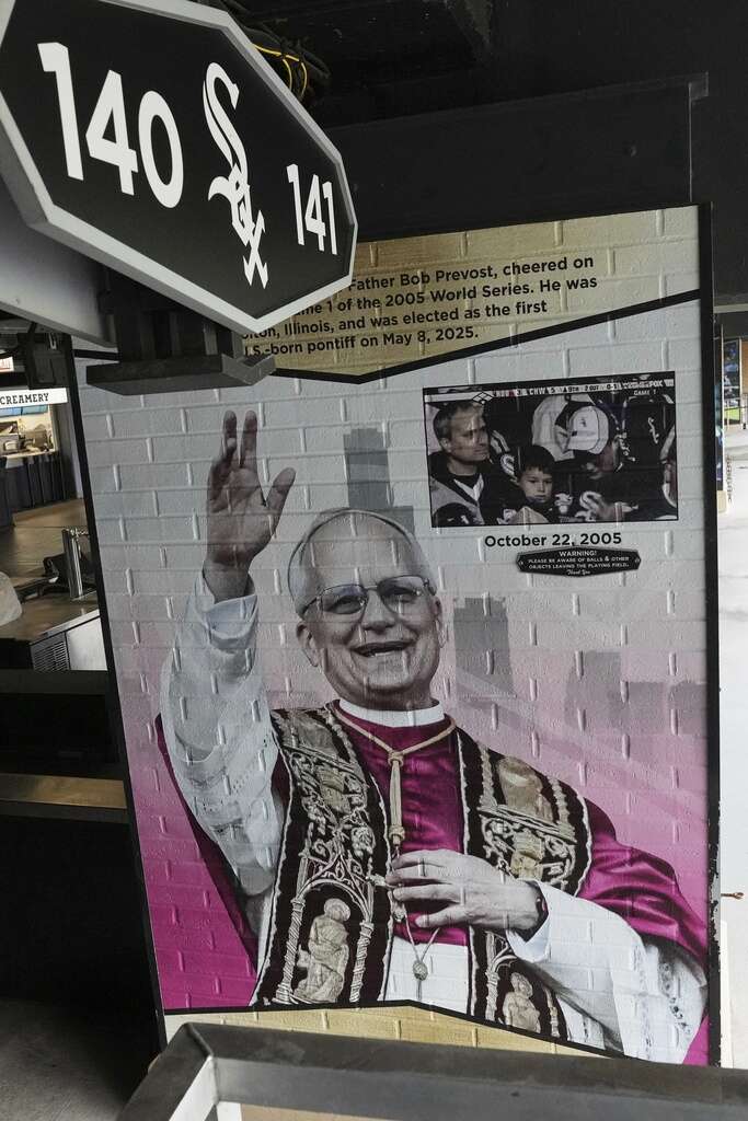 White Sox commemorate fandom of Pope Leo XIV with Graphic installation at Rate Field before a baseball game between the Seattle Mariners and the Chicago White Sox in Chicago, Monday, May 19, 2025. (AP Photo/Nam Y. Huh) AP