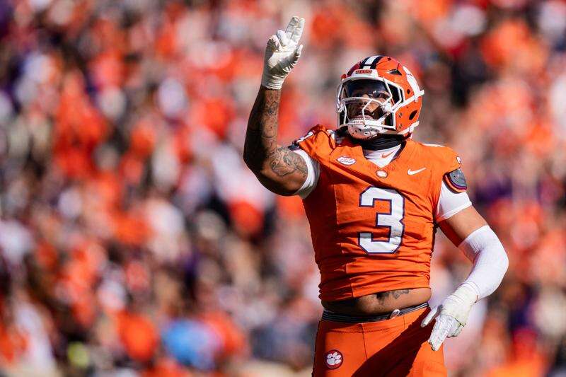 FILE — Clemson defensive end T.J. Parker (3) reacts during an NCAA college football game against South Carolina, Saturday, Nov. 30, 2024, in Clemson, S.C. (AP Photo/Jacob Kupferman, File) AP