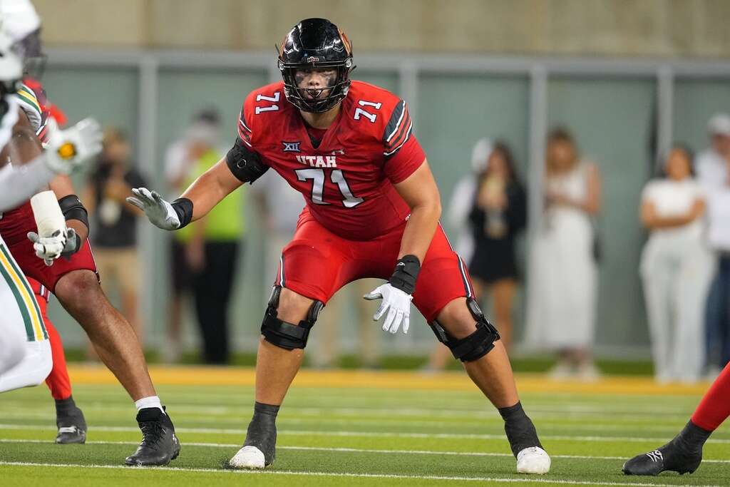 Utah offensive lineman Caleb Lomu blocks during the first half of an NCAA college football game between Baylor and Utah Saturday, Nov. 15, 2025, in Waco, Texas. (AP Photo/Julio Cortez) AP
