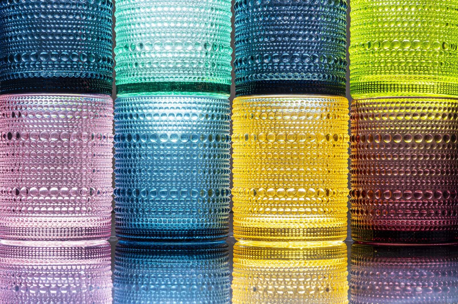 Kendrick notes that the glass is reminiscent of carnival glass, a style of glassware popular in the early 20th century that was made in colorful, often iridescent finishes and featured whimsical patterns pressed into the glass. “It’s a playful glass … as opposed to subtle elegance, this is very much the opposite,” she says. “It’s like going to the circus, and then you have all the colorways.”