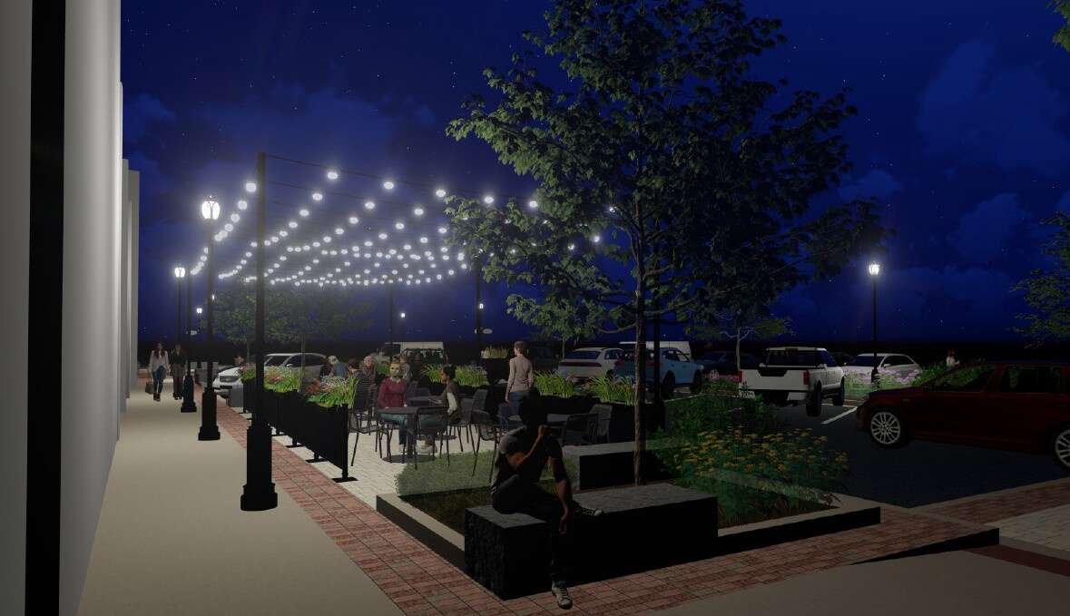 Renderings show string lights attached to lamp posts, outdoor seating, planter beds and decorative brick pavers.