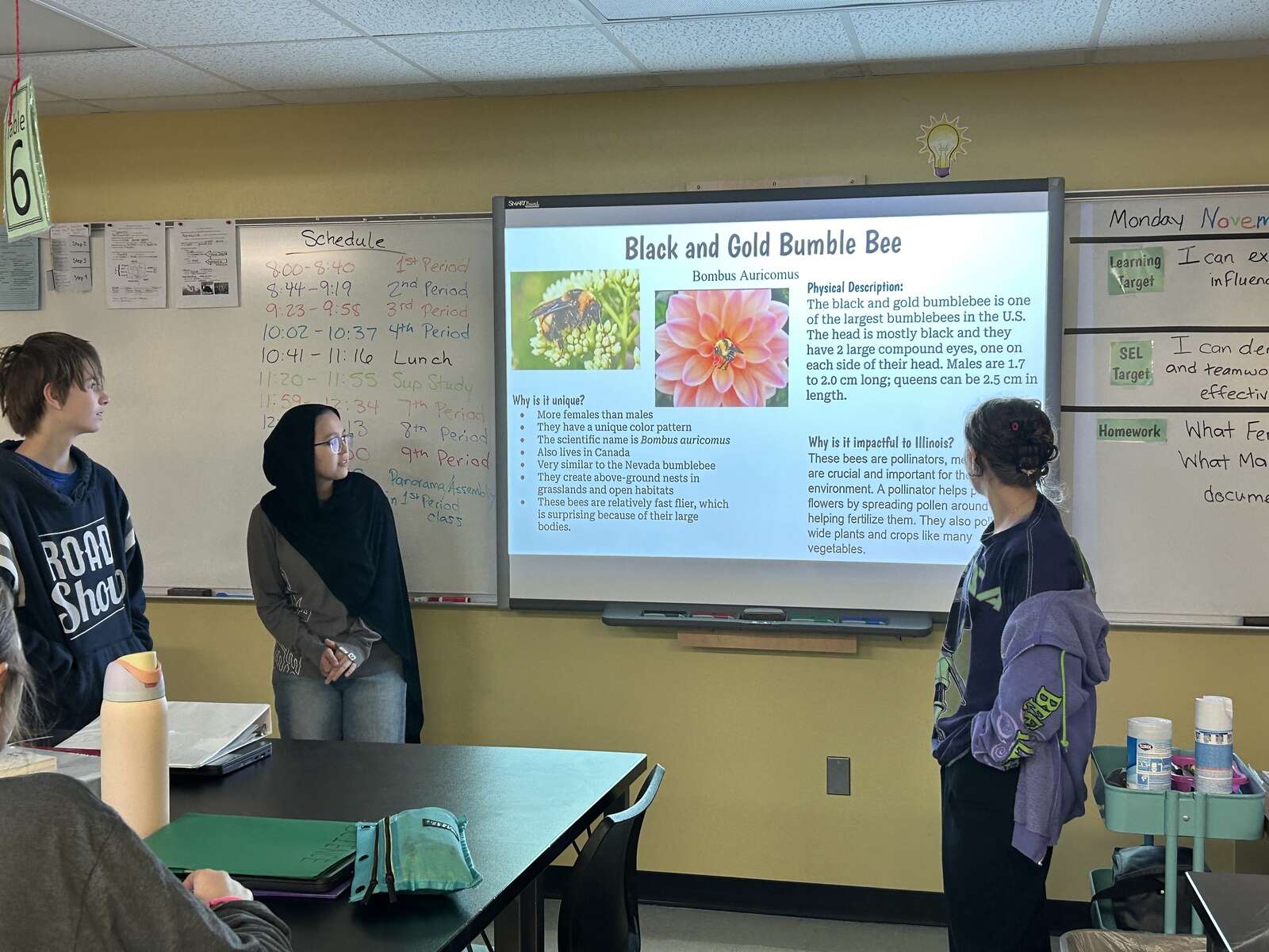She and other eighth graders researched their bees and narrowed the list of 10 to three finalists — the black and gold bumblebee, the bicolored sweat bee and the American bumblebee.