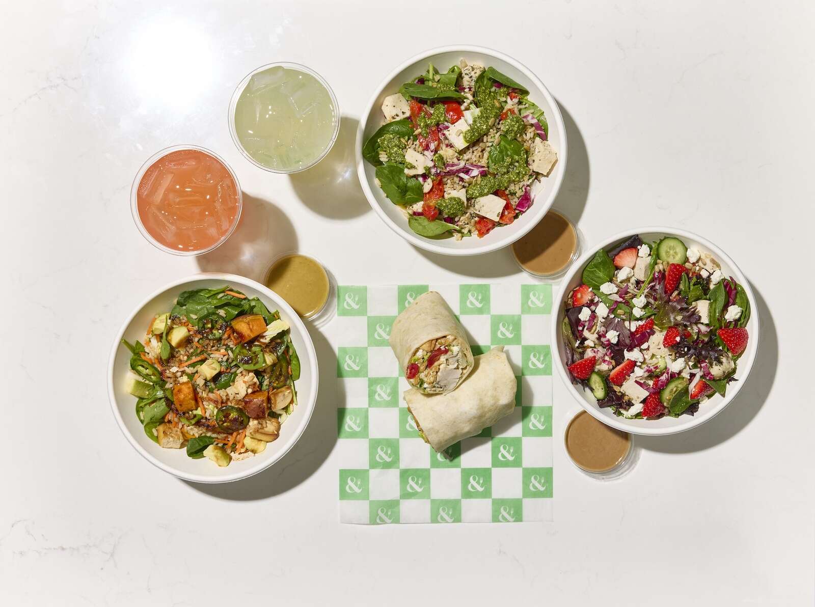 The lineup includes seasonal salads such as the Feta Believe It with mixed greens, spinach, roasted chicken, strawberries, feta, cucumber, radicchio, sunflower seeds and balsamic vinaigrette, and the Pesto Italiano, which features brown rice, spinach, roasted chicken, roasted tomatoes, shaved Parmesan, quinoa, radicchio, sunflower seeds, lemon squeeze, pesto and balsamic vinaigrette.