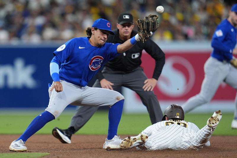 San Diego Padres' Bryce Johnson, below, safely steals second base as Cubs second baseman Nicky Lopez misses the catch during the fifth inning of a baseball game Tuesday, April 28, 2026, in San Diego. AP