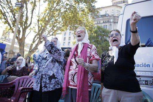 In this March 3, 2016 photo, Mothers of Plaza de Mayo human rights group shout slogans at their traditional Thursday march around the obelisk at Plaza de Mayo in Buenos Aires, Argentina. The human rights group began marching there in 1977 to demand answers from the military junta on their missing relatives. When President Barack Obamaâs state visit to Buenos Aires Wednesday, a day before the 40th anniversary of the 1976 military coup has raised questions about the United Statesâ relationship with one of the most repressive military dictatorships in Latin American history. (AP Photo/Victor R. Caivano)