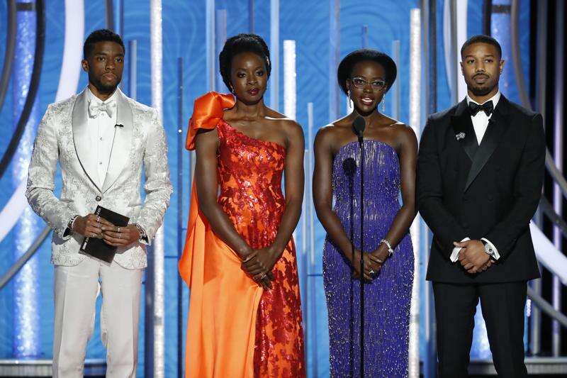 This image released by NBC shows the cast of "Black Panther," from left, Chadwick Boseman, Danai Gurira, Lupita Nyong'o and Michael B. Jordan presenting the award for best animated feature during the 76th Annual Golden Globe Awards at the Beverly Hilton Hotel, Sunday, Jan. 6, 2019 in Beverly Hills, Calif. (Paul Drinkwater/NBC via AP)