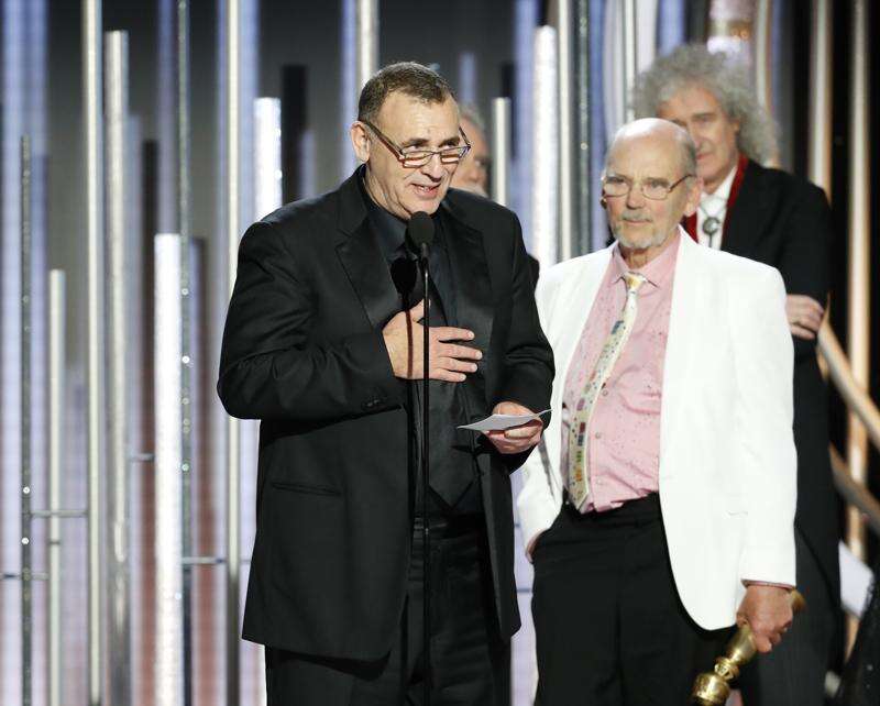 This image released by NBC shows Jim Beach accepting the award for best motion picture drama for "Bohemian Rhapsody" during the 76th Annual Golden Globe Awards at the Beverly Hilton Hotel on Sunday, Jan. 6, 2019, in Beverly Hills, Calif. (Paul Drinkwater/NBC via AP)
