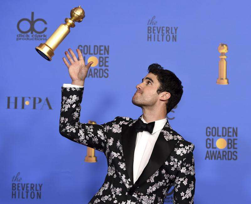 Darren Criss poses in the press room with the award for best performance by an actor in a limited series or a motion picture made for television for "The Assassination of Gianni Versace: American Crime Story" at the 76th annual Golden Globe Awards at the Beverly Hilton Hotel on Sunday, Jan. 6, 2019, in Beverly Hills, Calif. (Photo by Jordan Strauss/Invision/AP)