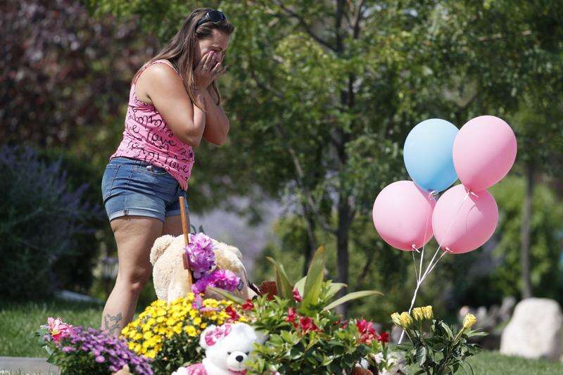 Ashley Bell reacts after leaving flowers among the tributes growing outside the home where a pregnant woman and her two daughters lived Thursday, Aug. 16, 2018, in Frederick, Colo. The woman's husband has been arrested in the disappearance of the woman and children. Authorities say that they have found the woman's body and believe to know the whereabouts of the two girls. (AP Photo/David Zalubowski)