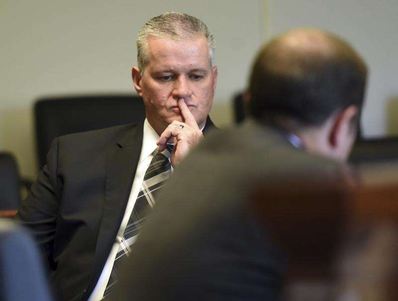 Weld County District Attorney Michael Rourke waits for the bond hearing for Christopher Watts to begin at Weld County Courthouse Thursday, Aug. 16, 2018, in Greeley, Colo. A judge has ordered Watts of Colorado who is accused of killing his pregnant wife and two young daughters held in jail without bail. (Joshua Polson/The Greeley Tribune via AP, Pool)