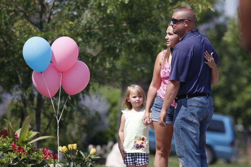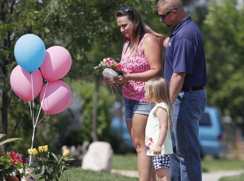 From left, 4-year-old Liberty Bell joins her mother, Ashley, and father Steven as they put a tribute with others outside the home where a pregnant woman and her two daughters lived Thursday, Aug. 16, 2018, in Frederick, Colo. The woman's husband has been arrested in the disappearance of the woman and children. Authorities say that they have found the woman's body and believe to know the whereabouts of the two girls. (AP Photo/David Zalubowski)