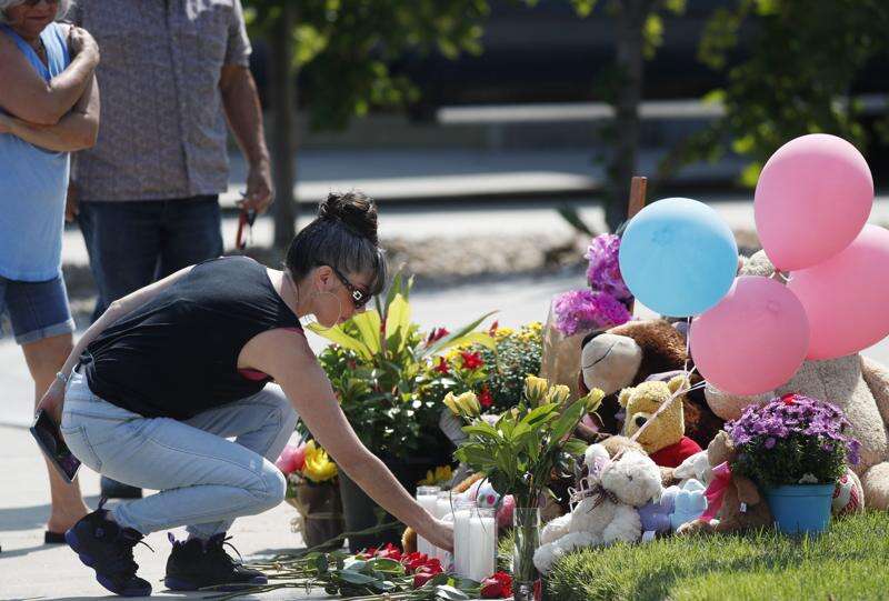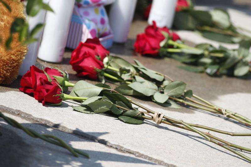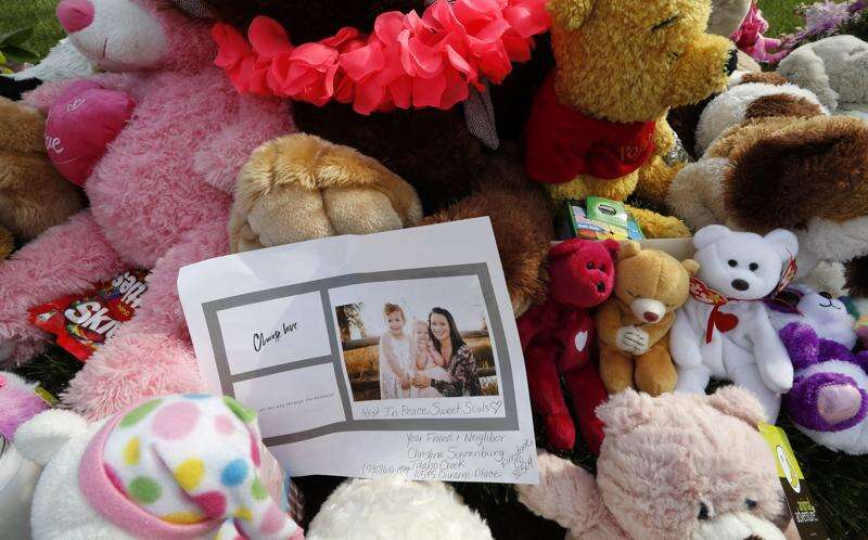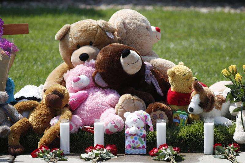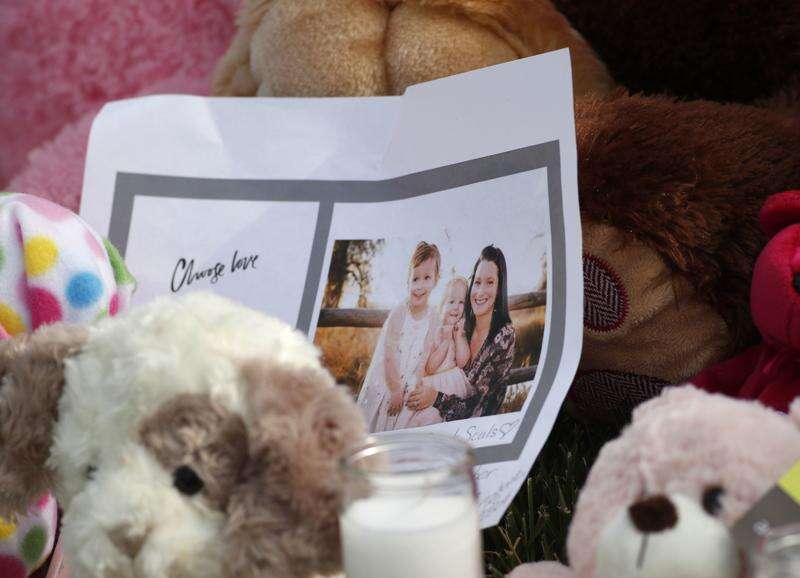 A photograph sits amid the tributes as they grow outside the home where a pregnant woman, Shanann Watts, and her two daughters, Bella and Celeste, lived Thursday, Aug. 16, 2018, in Frederick, Colo. The woman's husband, Christopher Watts, has been arrested on suspicion of killing his family. (AP Photo/David Zalubowski)