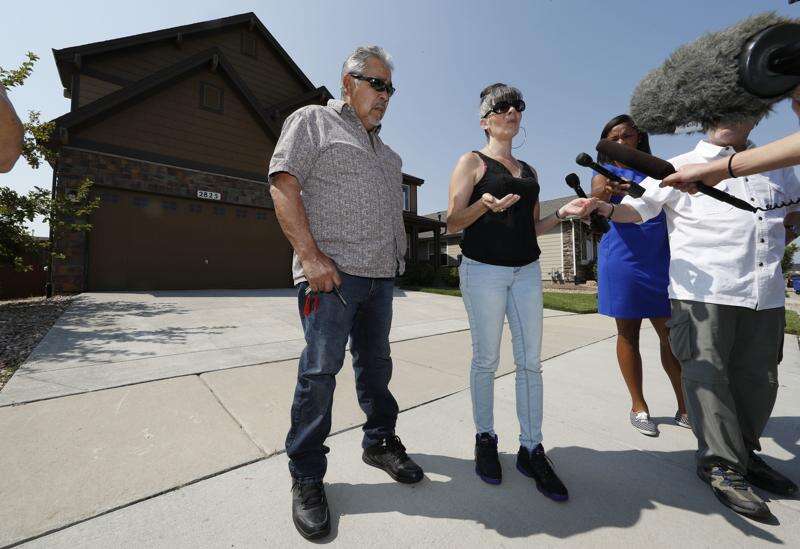 Baltasar Gutierrez, left, joins his daughter, Irene Montoya, in talking to reporters after they left a tributes outside the home where a pregnant woman and her two daughters lived Thursday, Aug. 16, 2018, in Frederick, Colo. The woman's husband has been arrested in the disappearance of the woman and children. Authorities say that they have found the woman's body and believe to know the whereabouts of the two girls. (AP Photo/David Zalubowski)