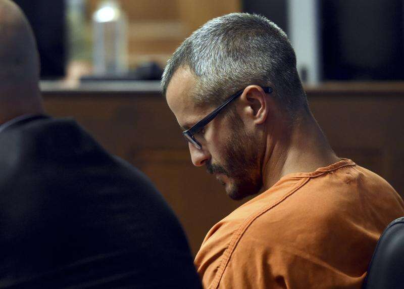 Christopher Watts looks down during his bond hearing at the Weld County Courthouse Thursday, Aug. 16, 2018, in Greeley, Colo. Watts, of Colorado, whose wife and daughters disappeared this week was arrested on suspicion of killing them. (Joshua Polson/The Greeley Tribune via AP, Pool)
