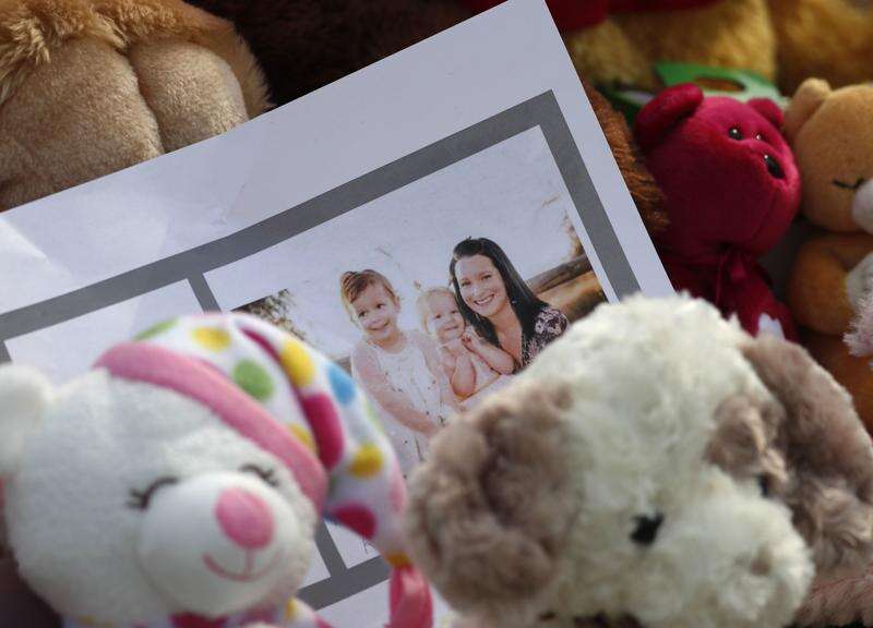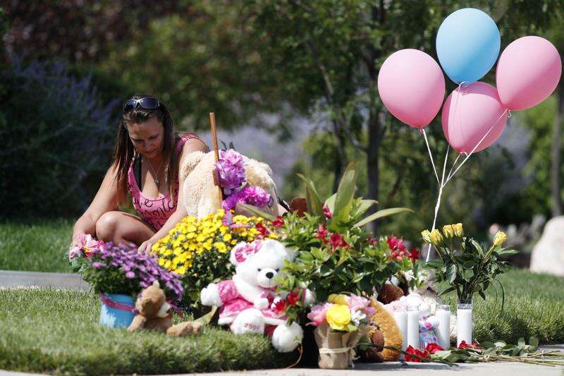 Tributes grow outside the home where a pregnant woman and her two daughters lived Thursday, Aug. 16, 2018, in Frederick, Colo. The woman's husband has been arrested in the disappearance of the woman and children. Authorities say that they have found the woman's body and believe to know the whereabouts of the two girls. (AP Photo/David Zalubowski)