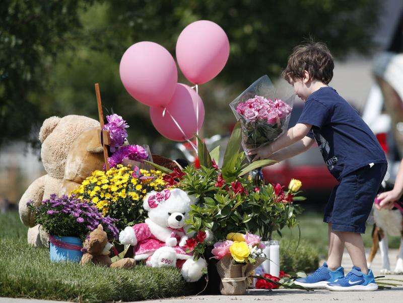 An unidentified young boy places a bouquet of flowers on a pile of tributes outside the home where a pregnant woman and her two daughters lived Thursday, Aug. 16, 2018, in Frederick, Colo. The woman's husband has been arrested in the disappearance of the woman and children. Authorities say that they have found the woman's body and believe to know the whereabouts of the two girls. (AP Photo/David Zalubowski)
